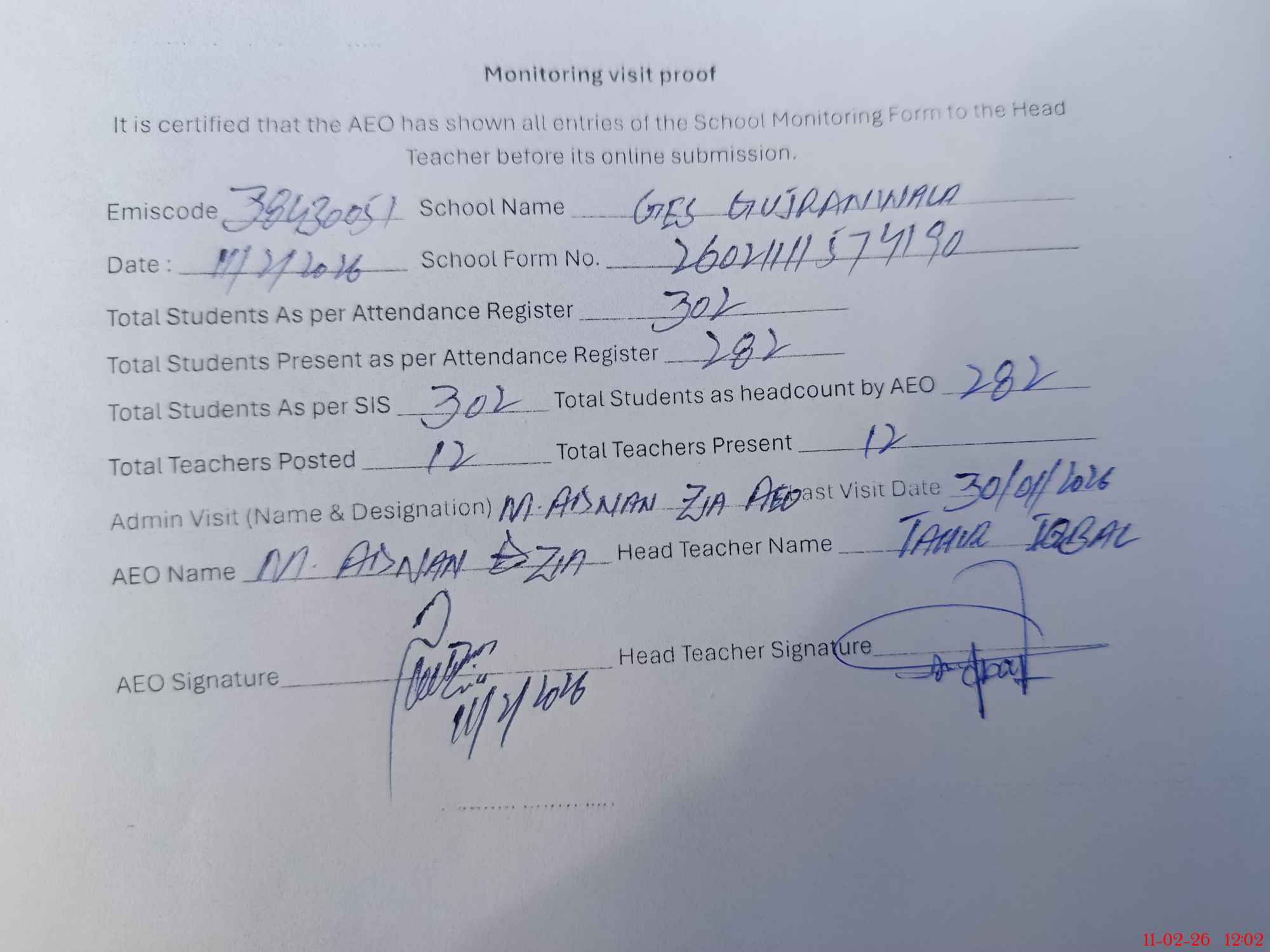 | Monitoring Date: 11-02-2026 | Start Time: 11-02-2026 11:30 AM | End Time: 11-02-2026 12:04 PM | Name of MEA: Mu**** Ad**** Zi**** | |