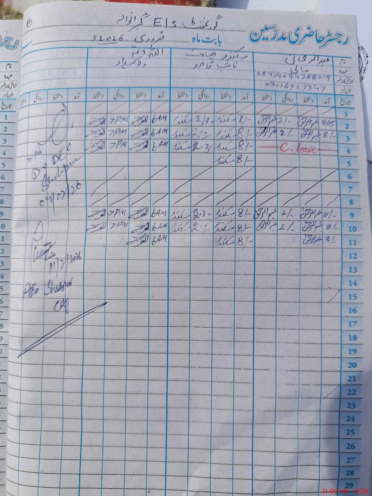 | CNIC | Full Name | Designation | R/C | Absence During Last Calender Month |