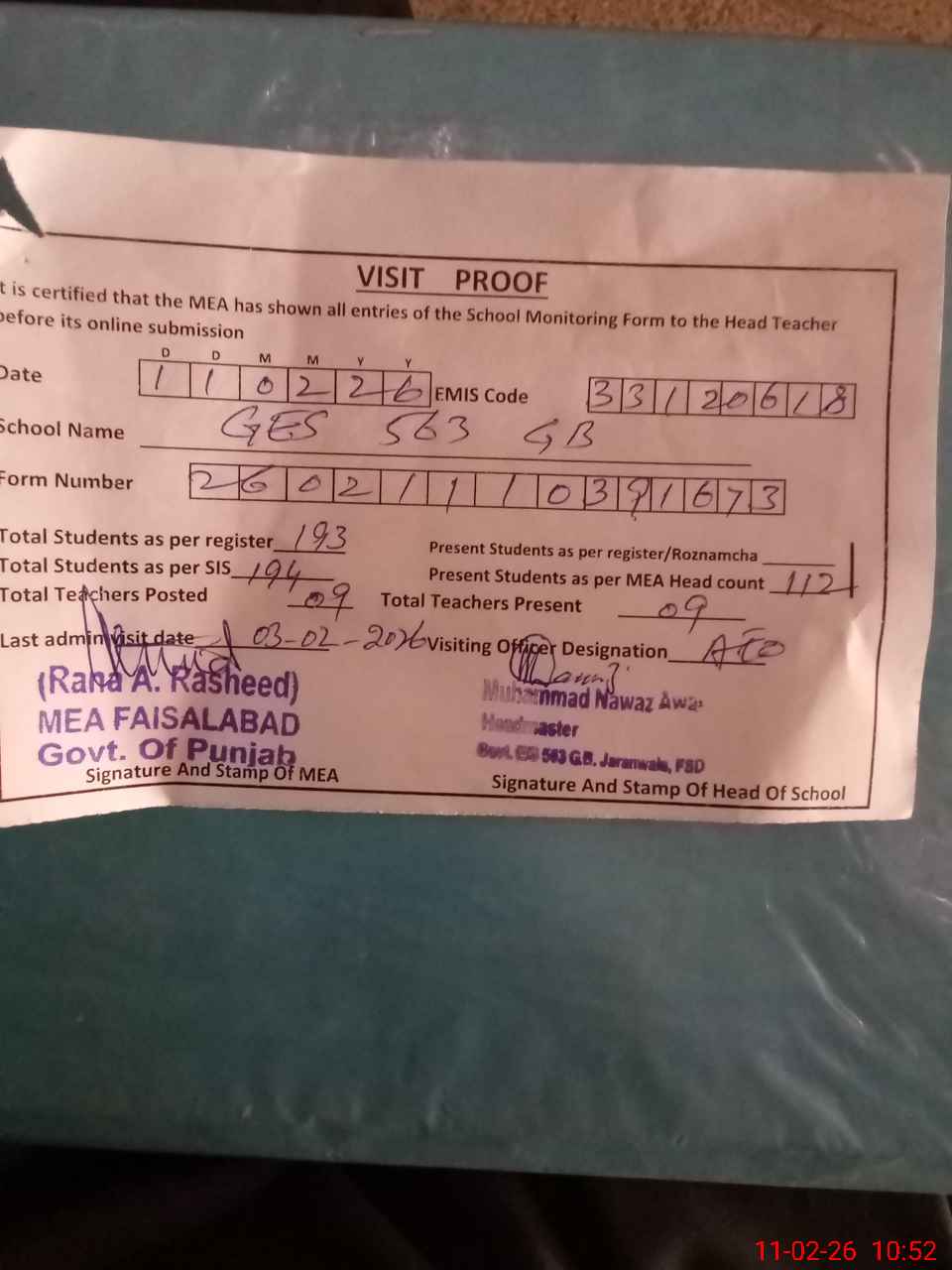 | Attendance Register | Head Teacher | MEA with School | Visit Proof |
