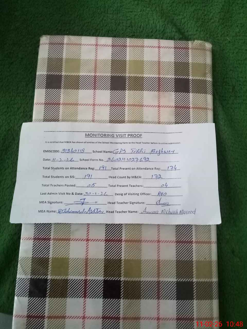 | Monitoring Date: 11-02-2026 | Start Time: 11-02-2026 10:27 AM | End Time: 11-02-2026 10:49 AM | Name of MEA: Mu**** Ak**** | |