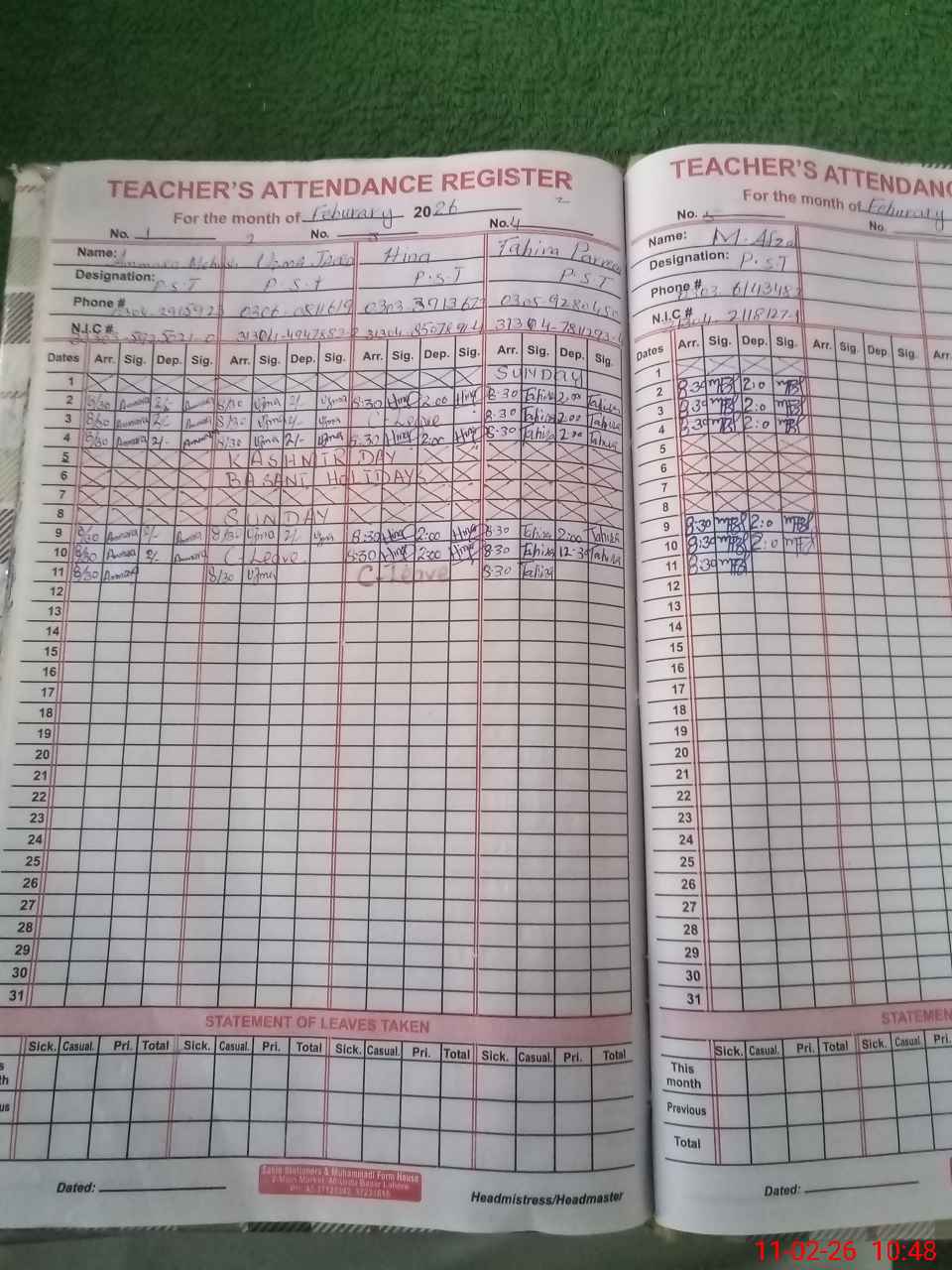 | CNIC | Full Name | Designation | R/C | Absence During Last Calender Month |