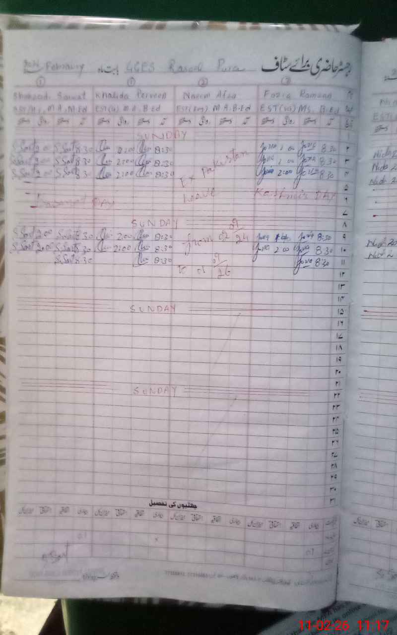 | Remarks (Use Separate Page if Required): Teacher Bushra pst was temporarily attached but latest orders not available so mark her absent About 100 students are sitting under corridor or shed This school is facing shortage of class rooms FTF register not maintained and updated | |||||