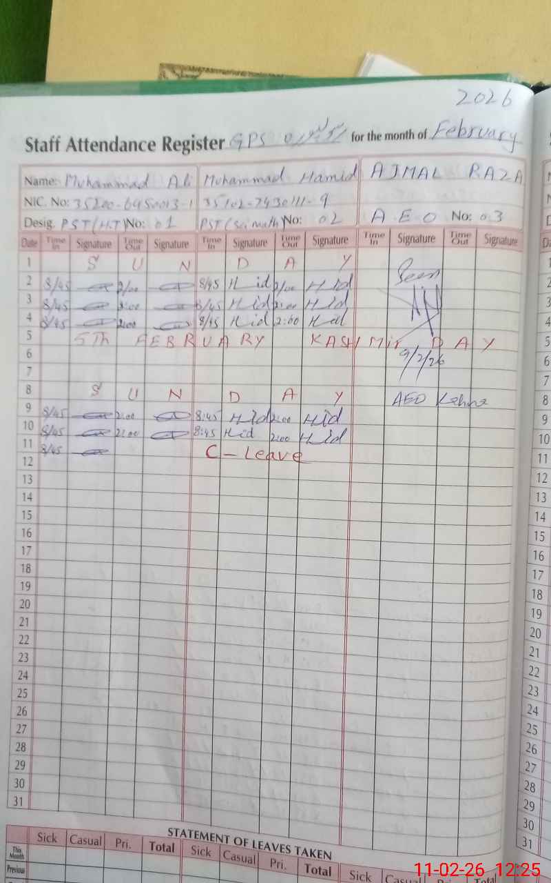 | CNIC | Full Name | Designation | R/C | Absence During Last Calender Month |