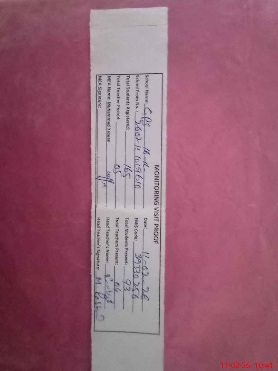 | Attendance Register | Head Teacher | MEA with School | Visit Proof |