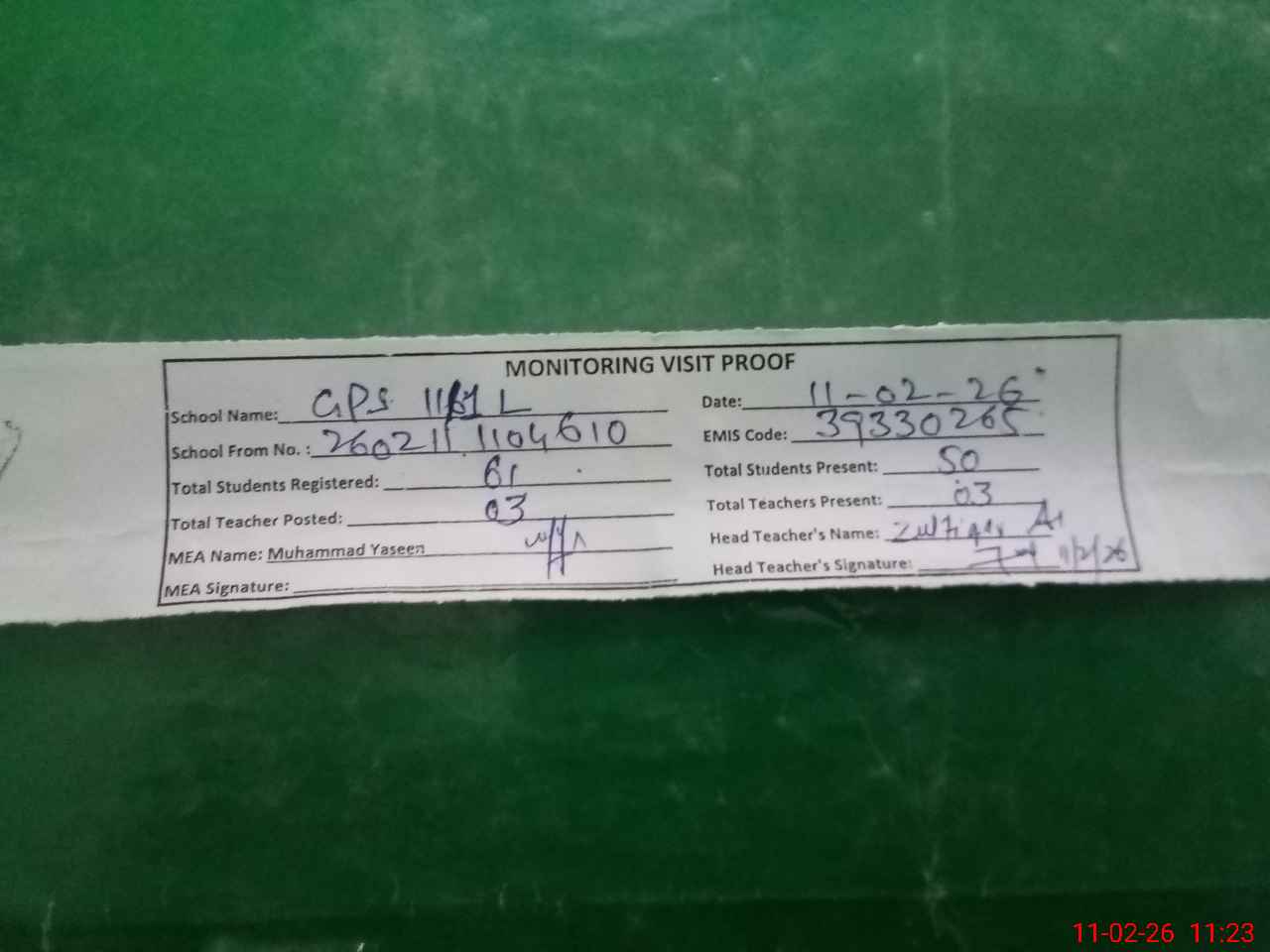 | Attendance Register | Head Teacher | MEA with School | Visit Proof |