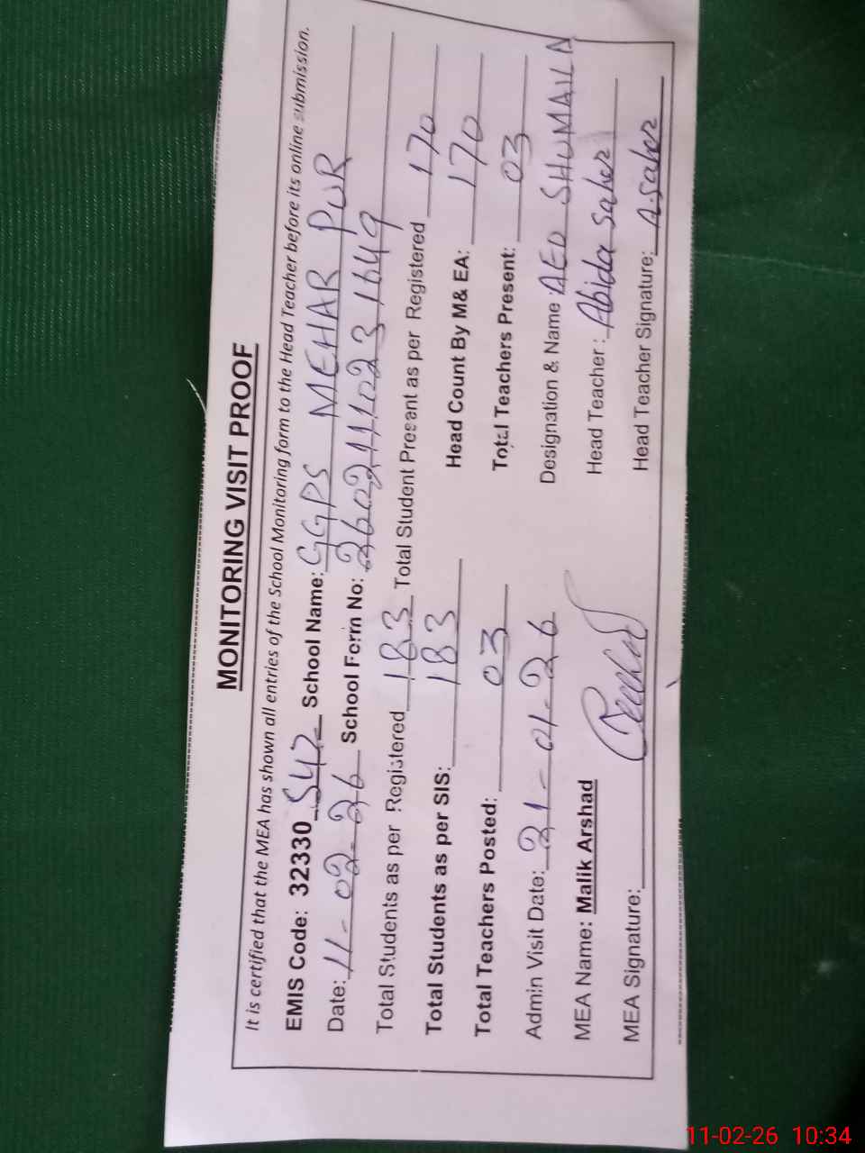 | EMIS Code: 32330542 | Name of School: GGPS MEHAR PUR | |||