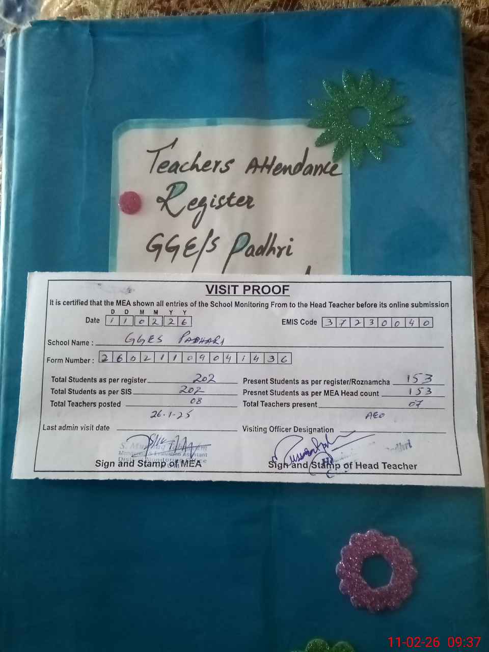 | Attendance Register | Head Teacher | MEA with School | Visit Proof |