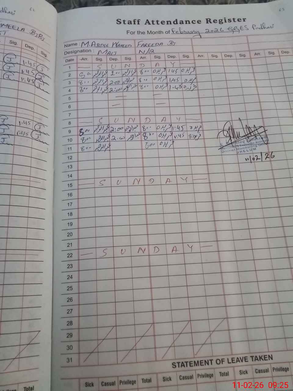 | CNIC | Full Name | Designation | R/C | Absence During Last Calender Month |