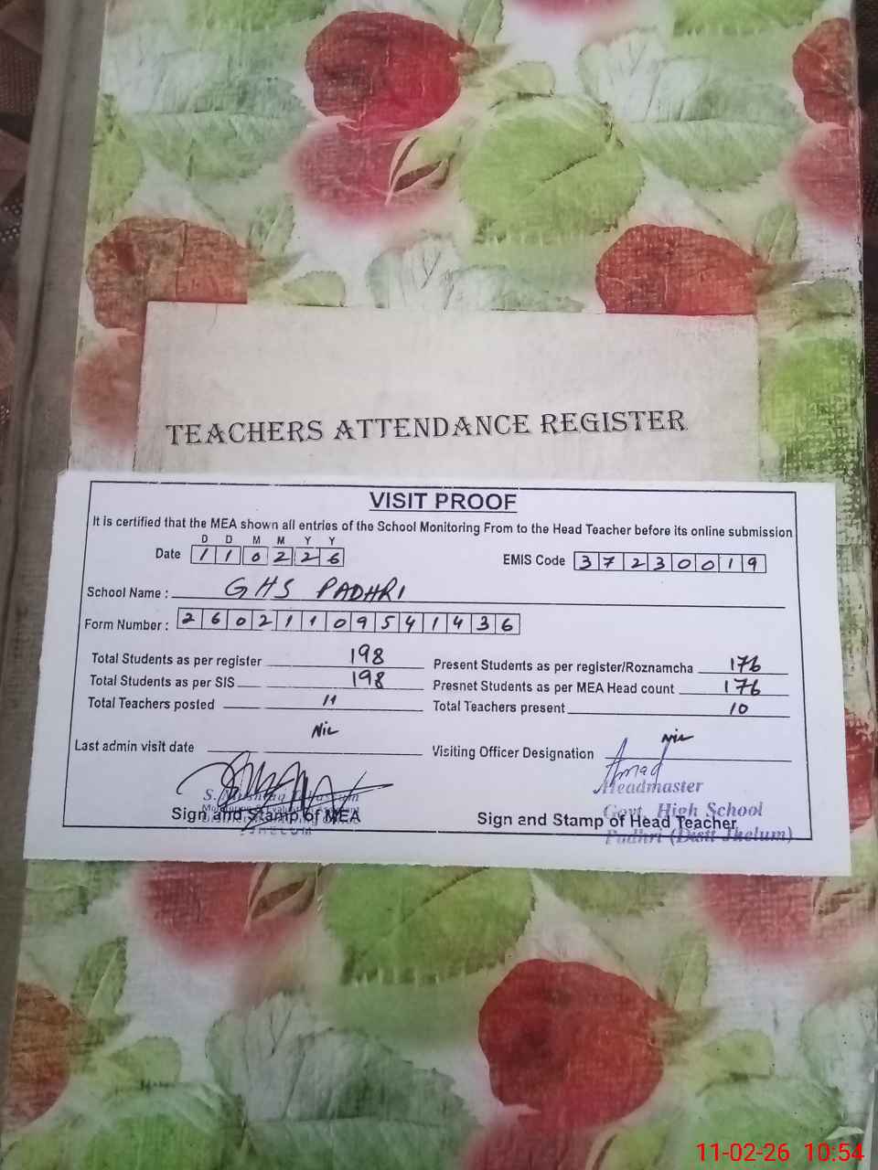 | Attendance Register | Head Teacher | MEA with School | Visit Proof |