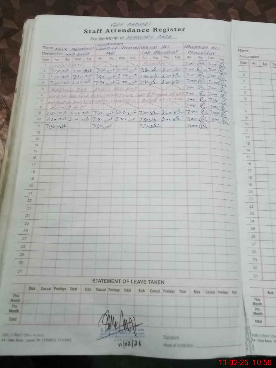 | CNIC | Full Name | Designation | R/C | Absence During Last Calender Month |