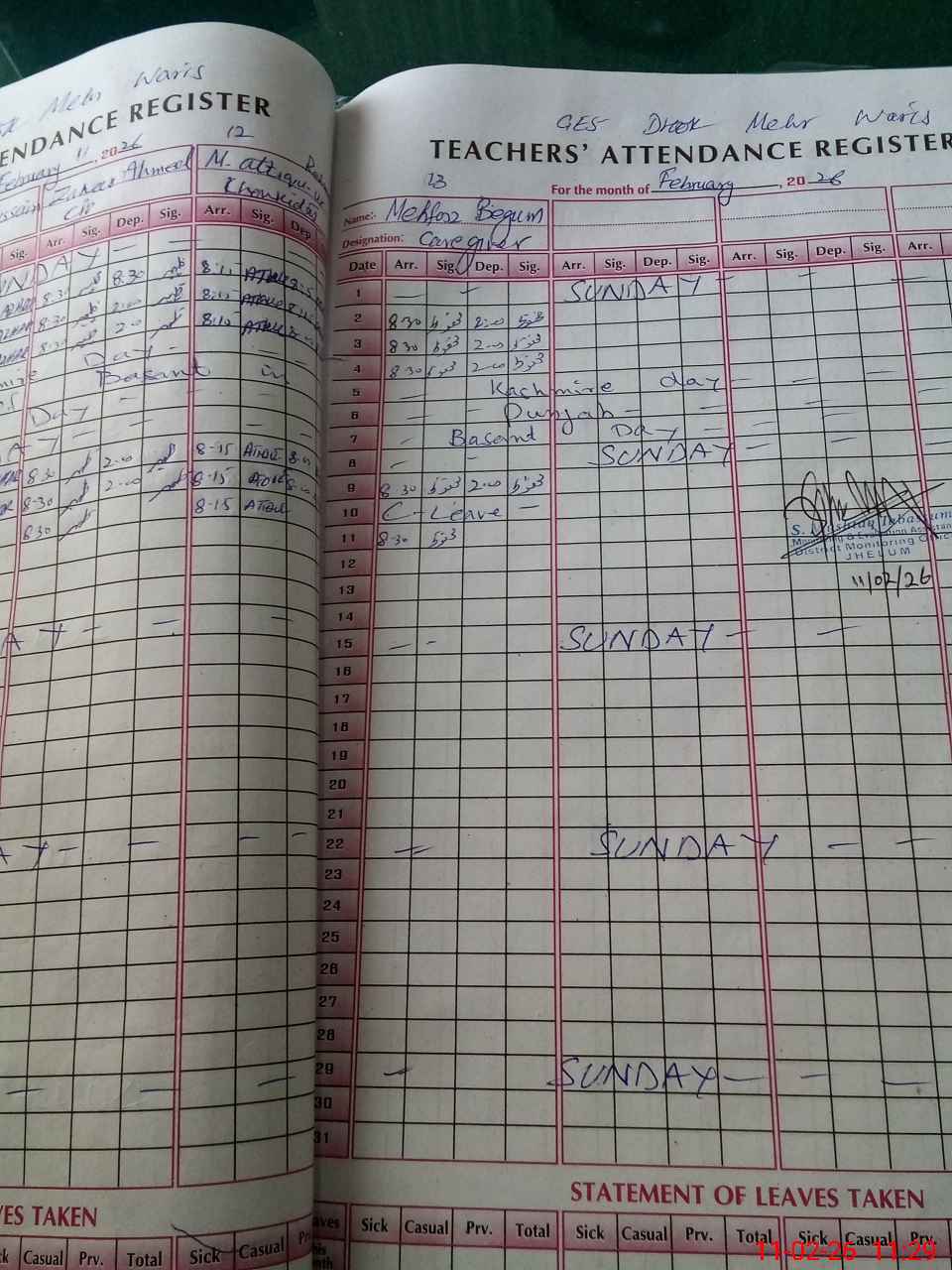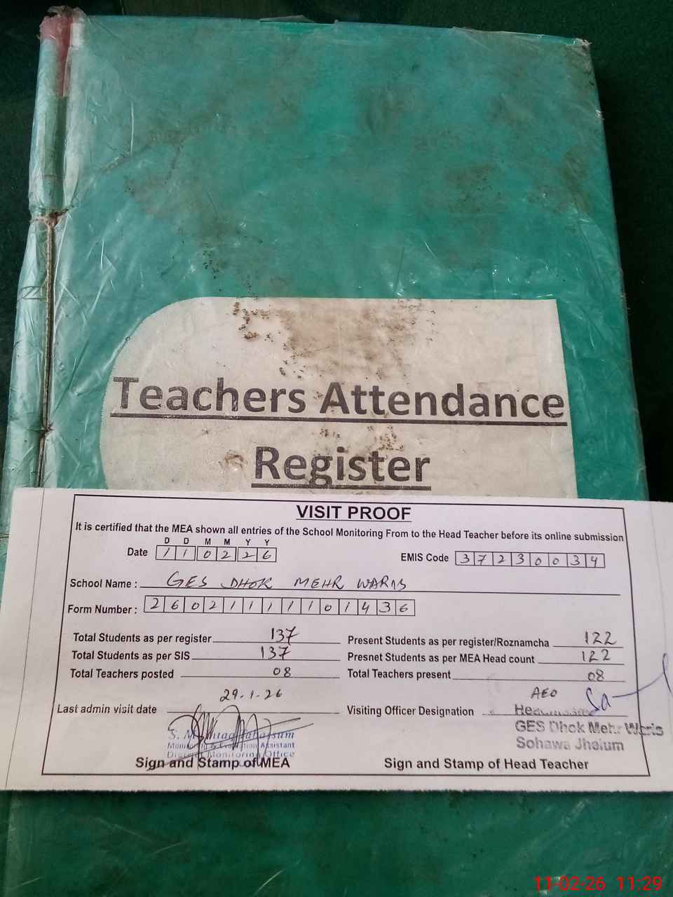 | Attendance Register | Head Teacher | MEA with School | Visit Proof |