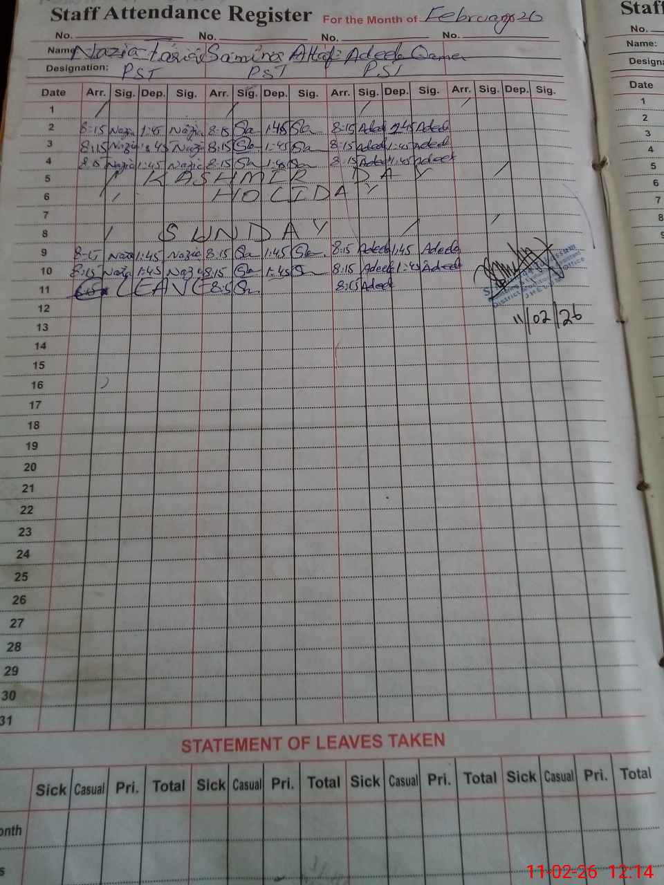 | Remarks (Use Separate Page if Required): HT Nazia Tariq is on CL today. | |||||