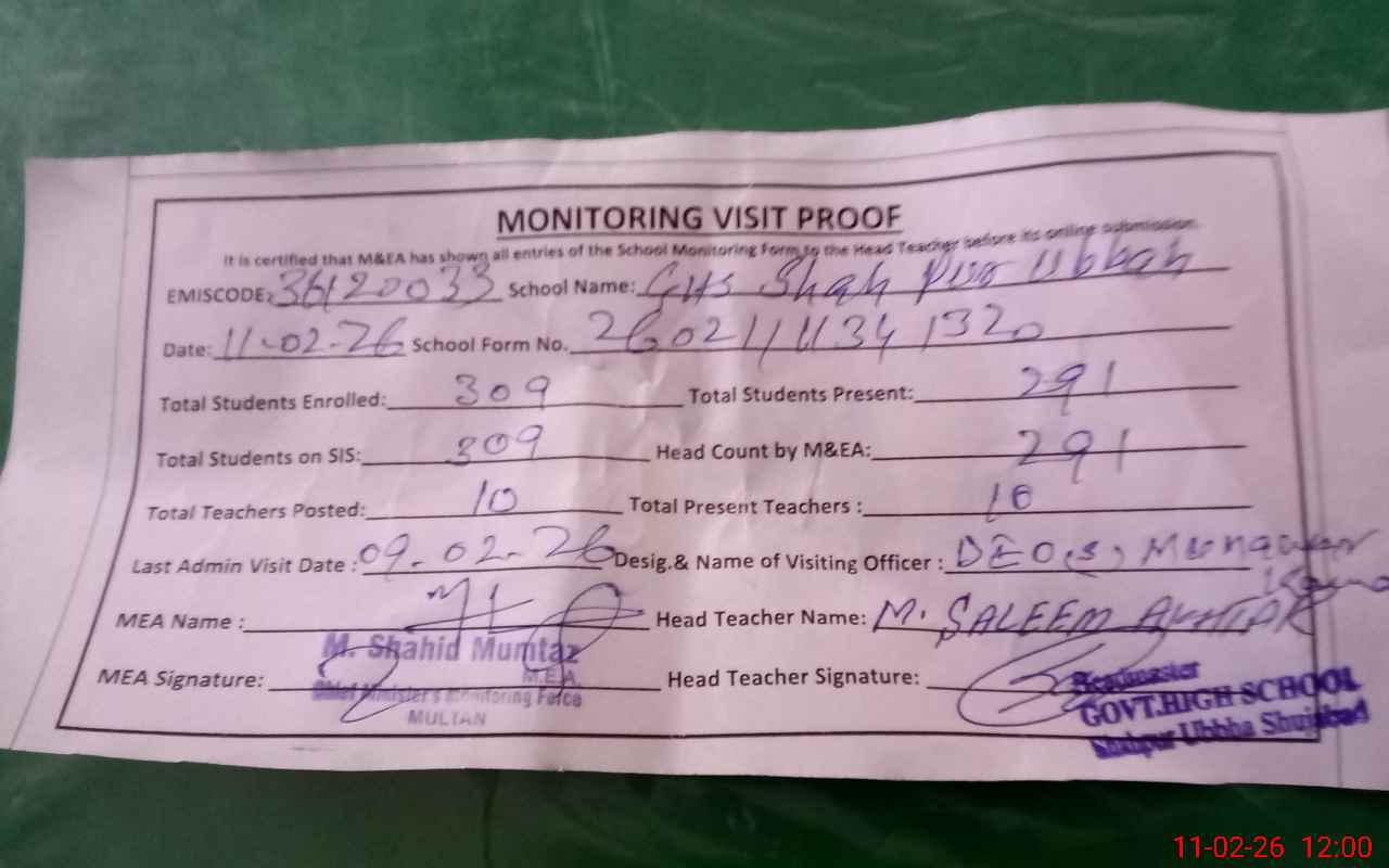 | EMIS Code: 36120033 | Name of School: GHS SHAH PUR UBBHA SHUJABAD | |||