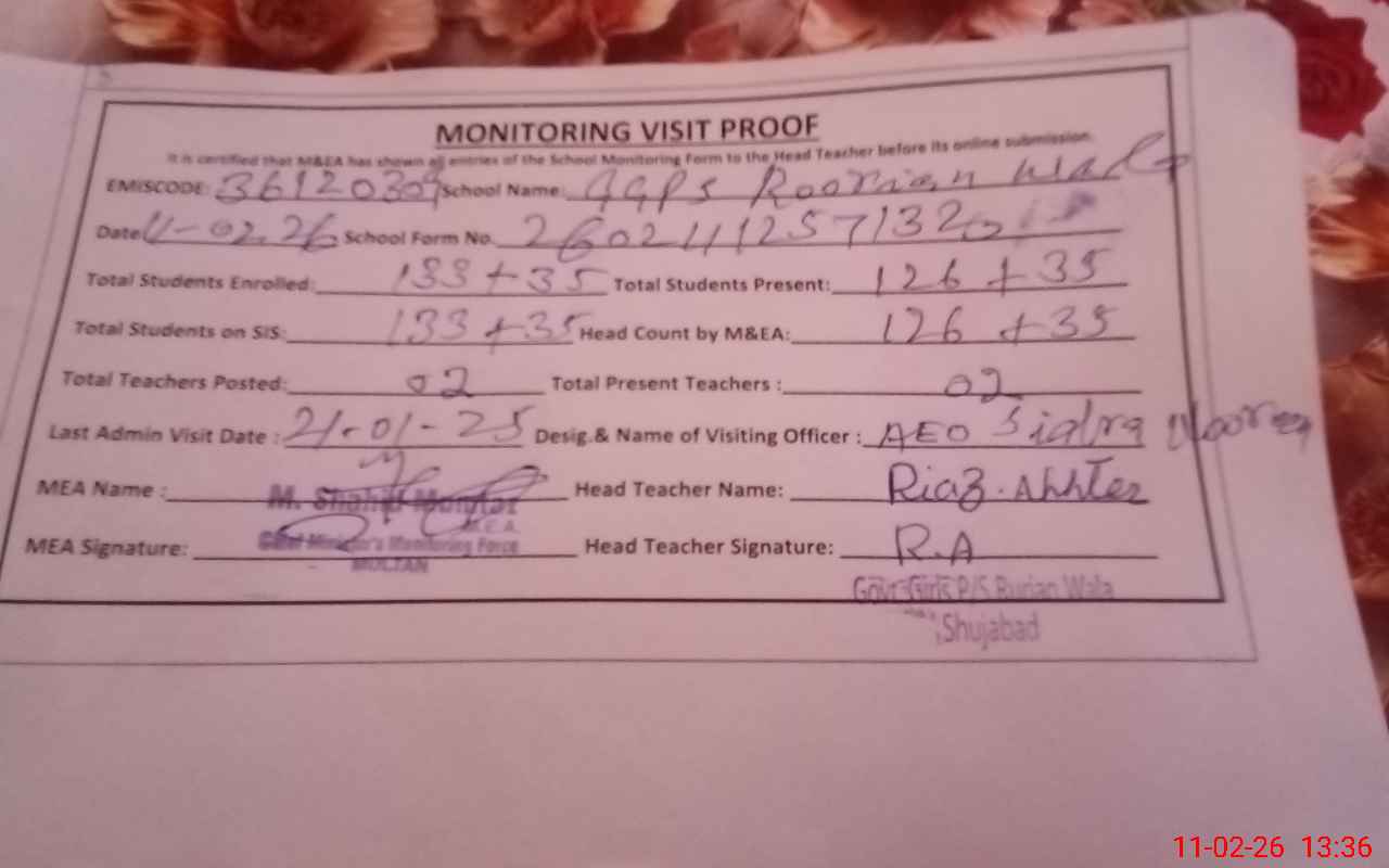 | EMIS Code: 36120309 | Name of School: GGPS ROORIAN WALA SHUJABAD | |||