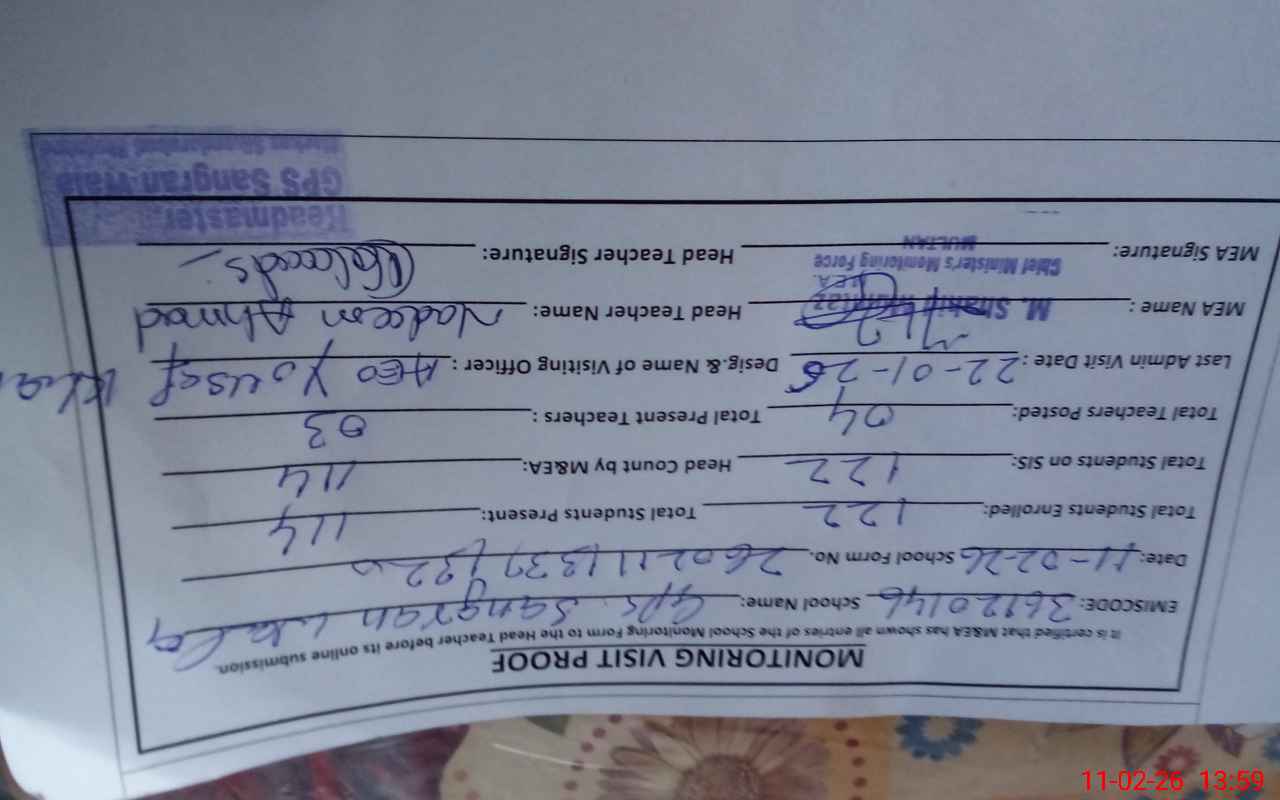 | Certified that this School was Inspected by the Undersigned MEA/DMO Today and the Information Stated Above is as Per Record. | |||||
