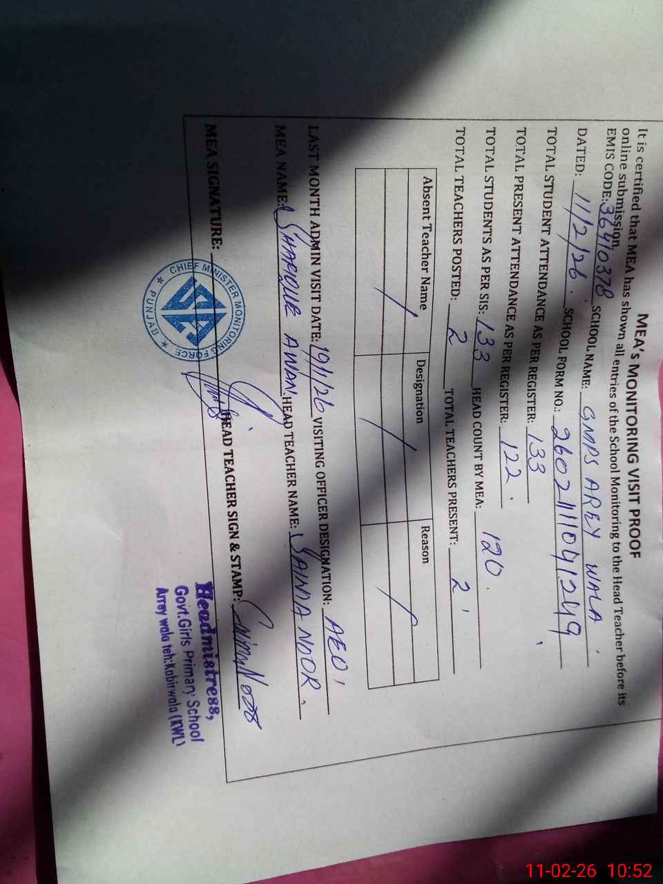 | Monitoring Date: 11-02-2026 | Start Time: 11-02-2026 10:23 AM | End Time: 11-02-2026 10:52 AM | Name of MEA: SH**** AH**** | |