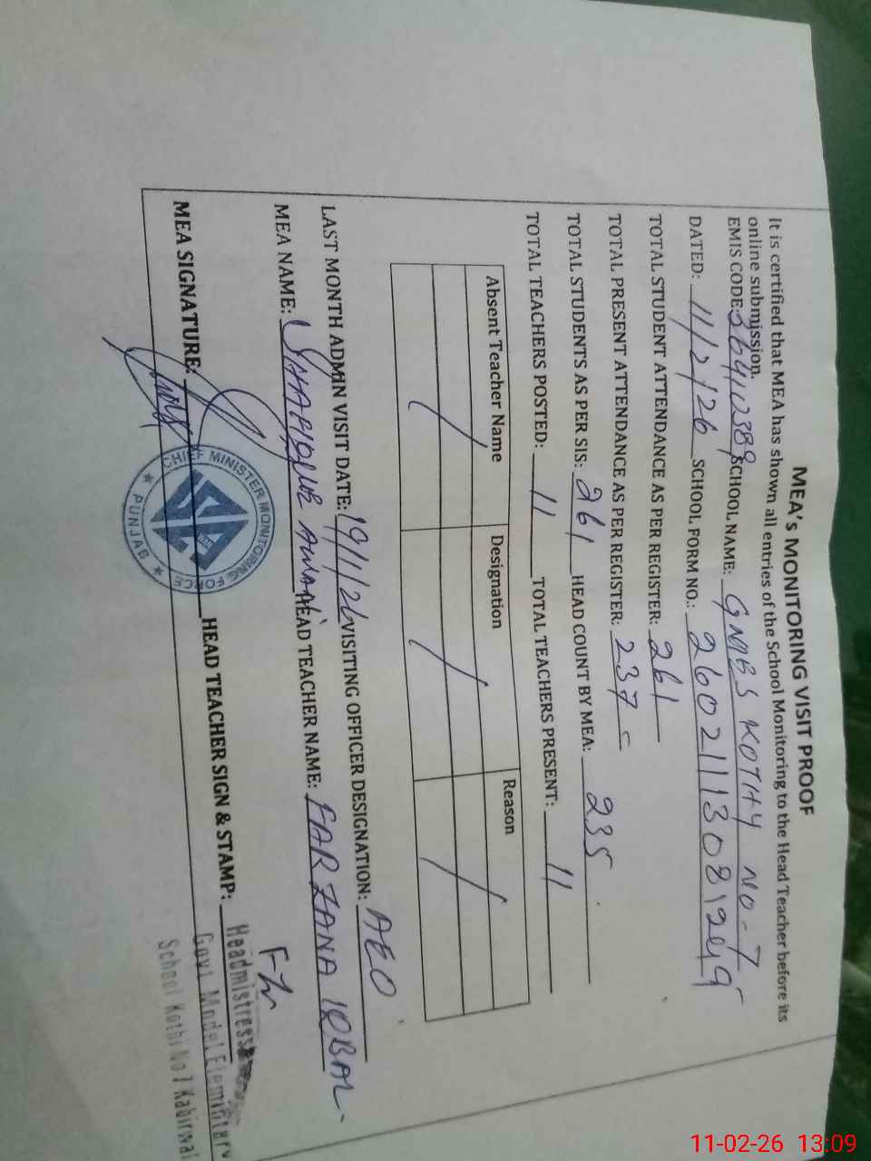 | Attendance Register | Head Teacher | MEA with School | Visit Proof |