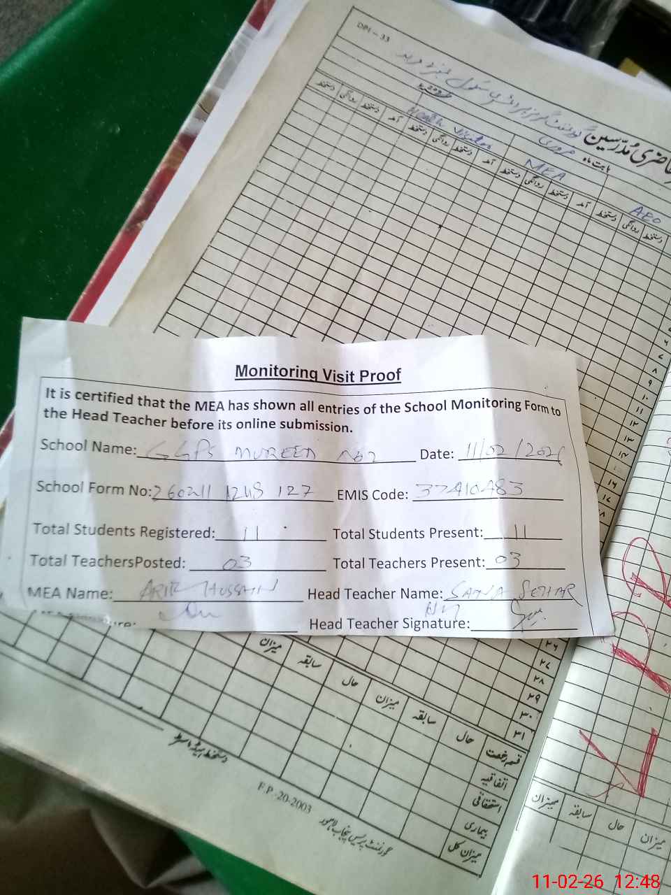 | Attendance Register | Head Teacher | MEA with School | Visit Proof |