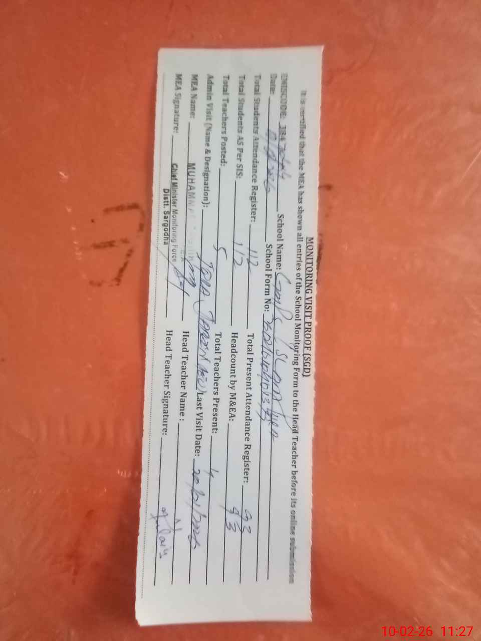 | Attendance Register | Head Teacher | MEA with School | Visit Proof |