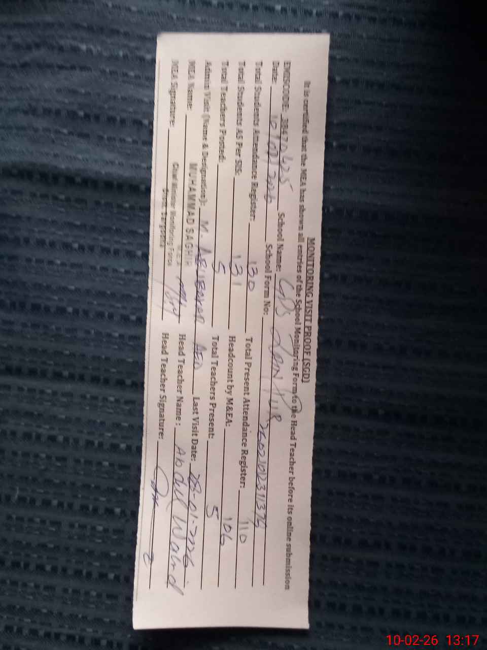 | Attendance Register | Head Teacher | MEA with School | Visit Proof |