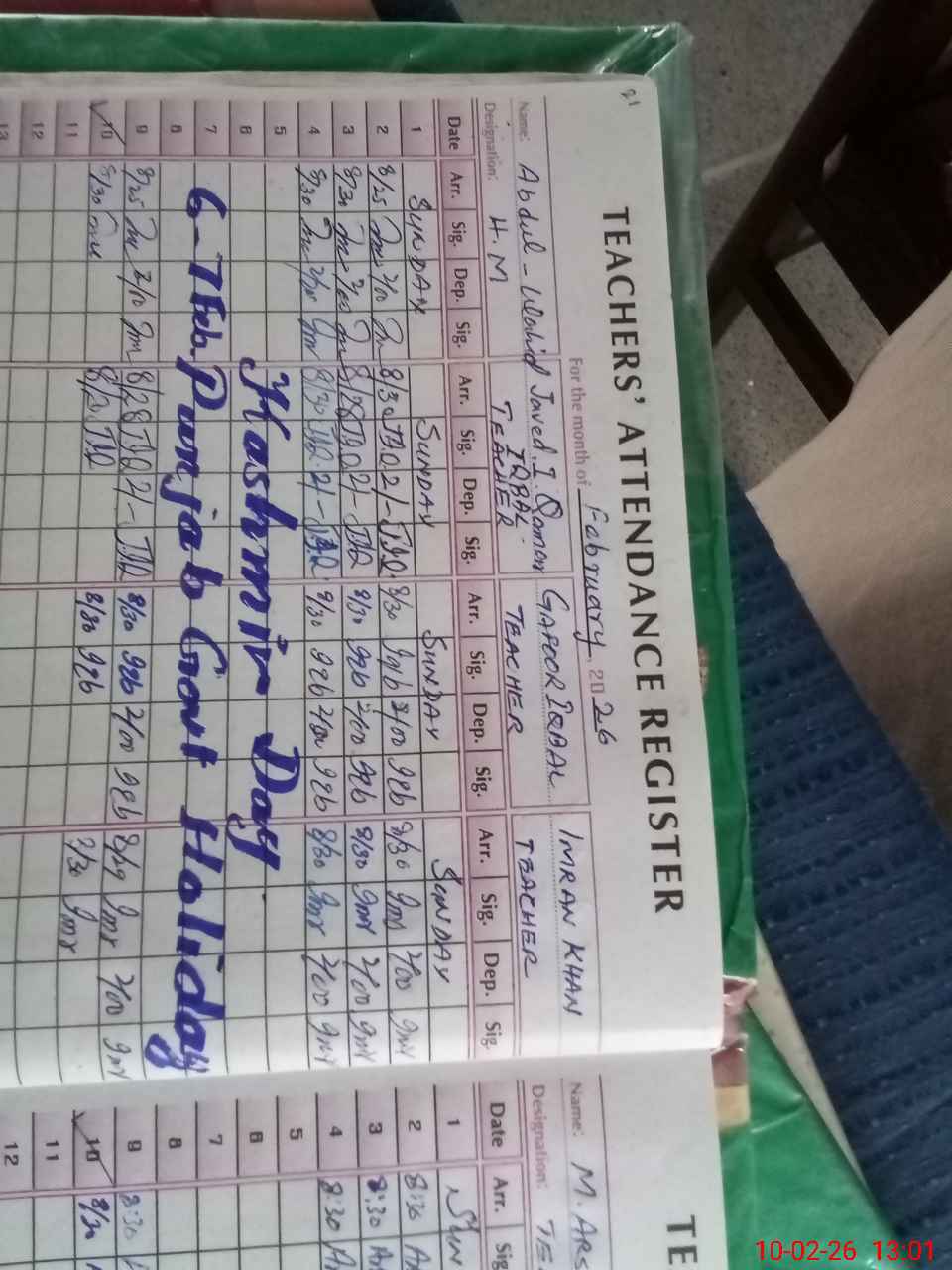 | CNIC | Full Name | Designation | R/C | Absence During Last Calender Month |