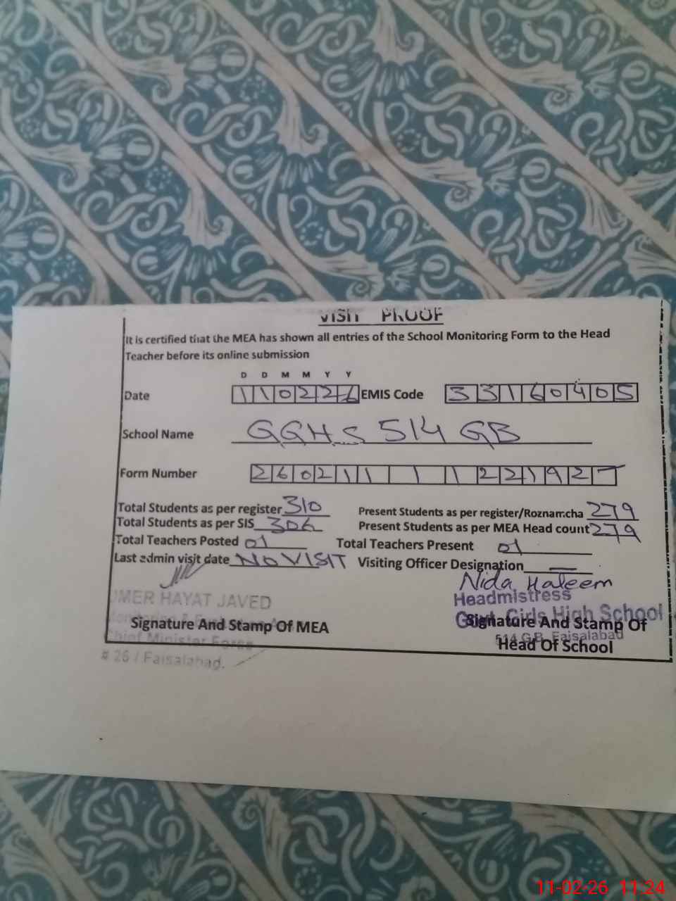 | Attendance Register | Head Teacher | MEA with School | Visit Proof |