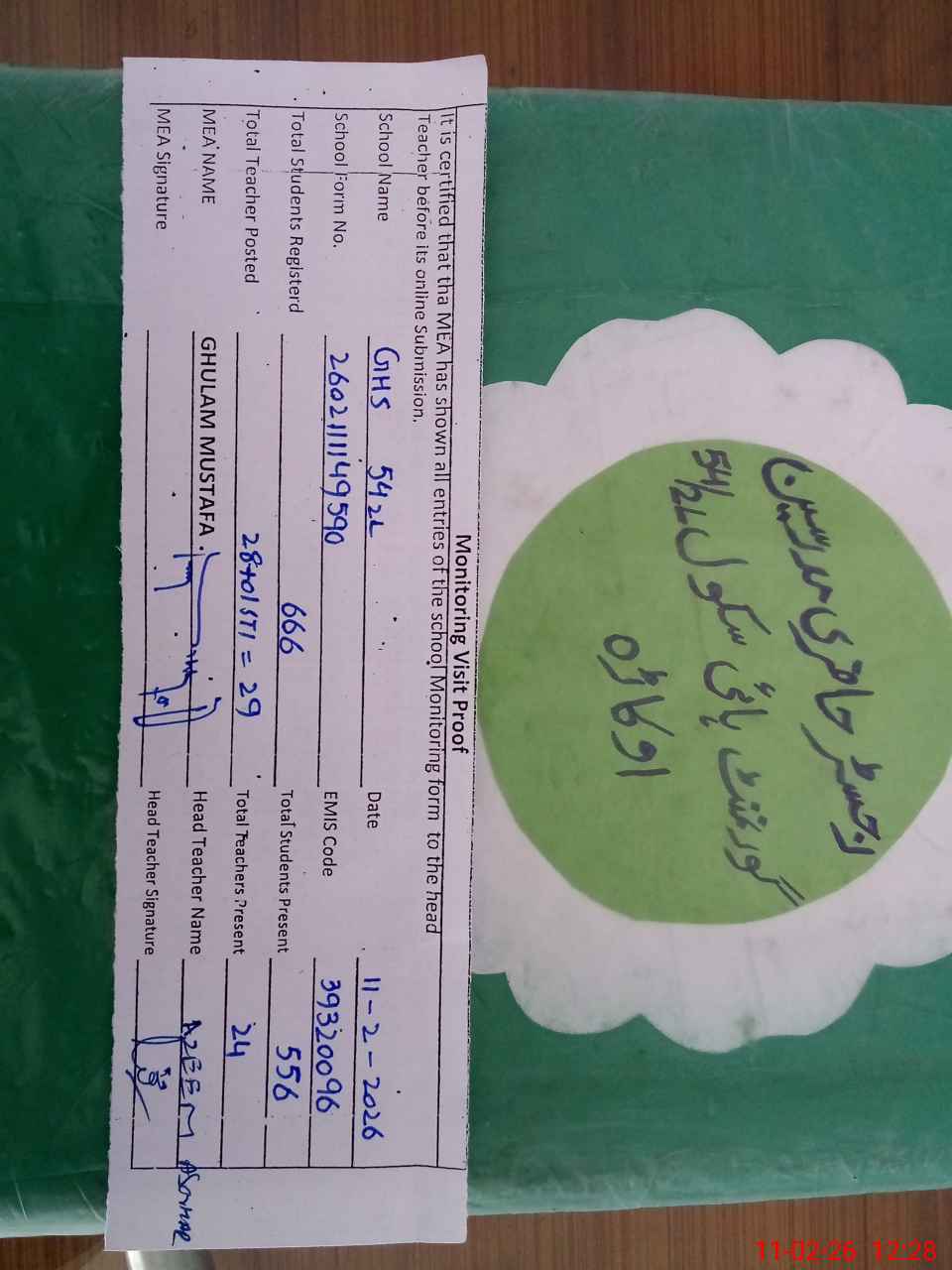 | Attendance Register | Head Teacher | MEA with School | Visit Proof |