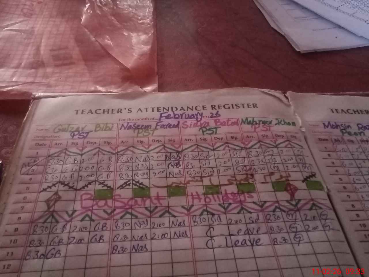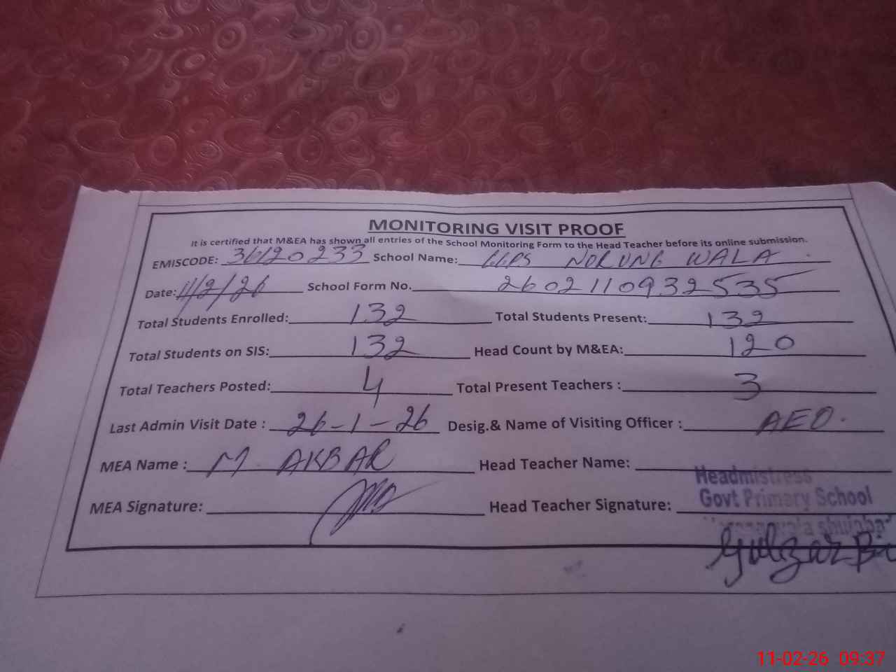 | Attendance Register | Head Teacher | MEA with School | Visit Proof |