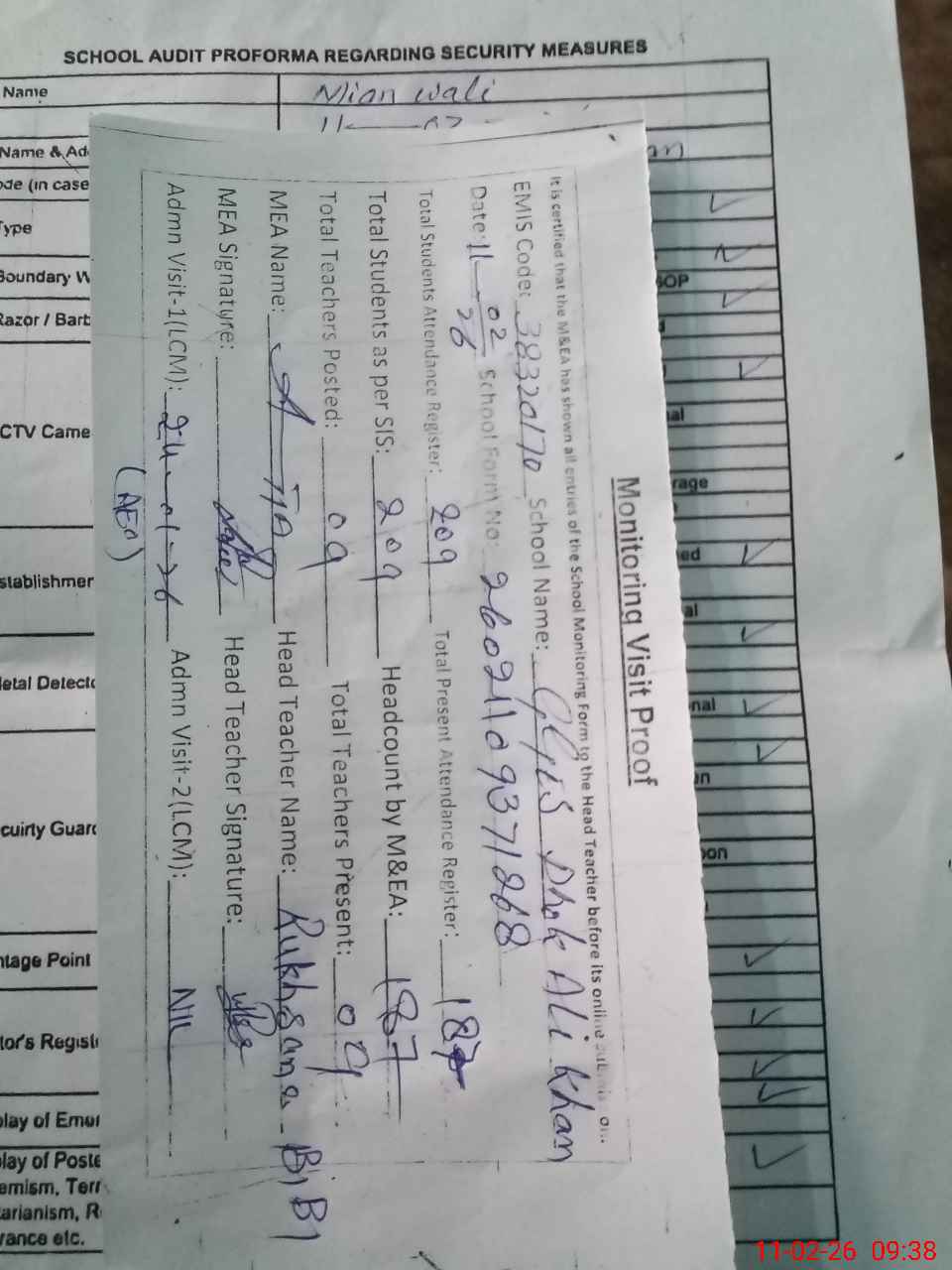 | Certified that this School was Inspected by the Undersigned MEA/DMO Today and the Information Stated Above is as Per Record. | |||||