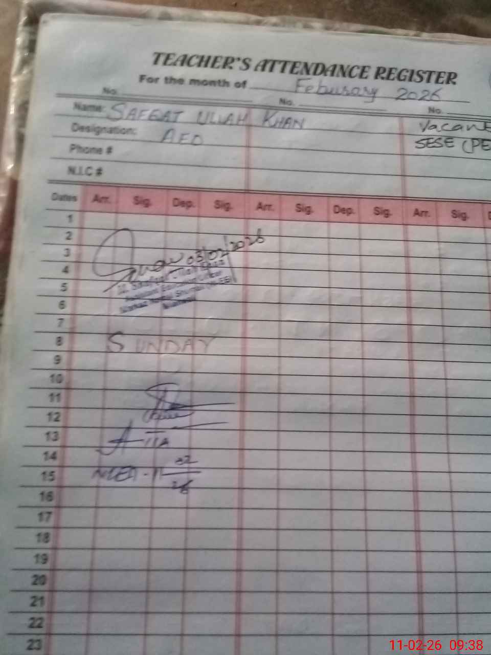 | CNIC | Full Name | Designation | R/C | Absence During Last Calender Month |