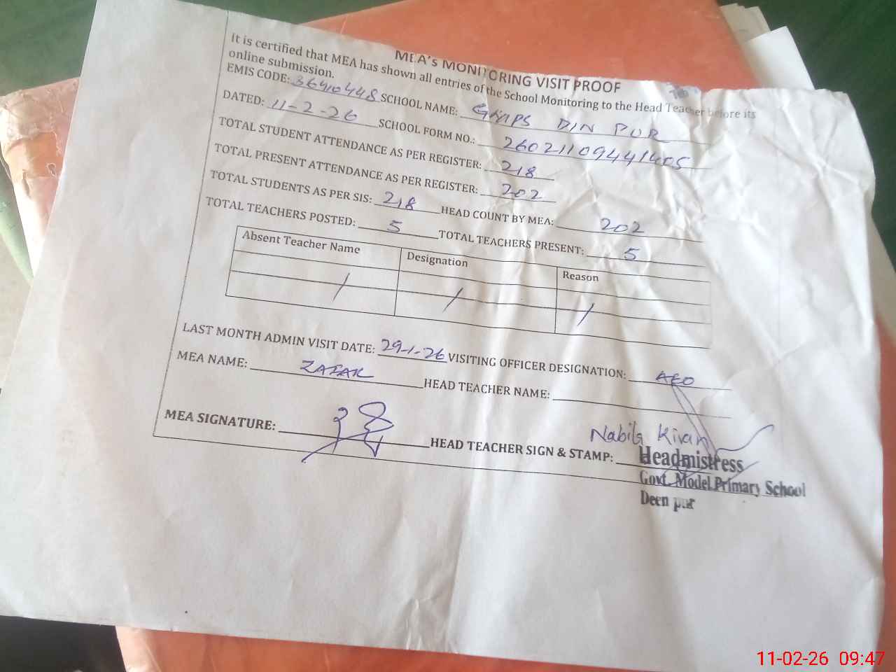 | Attendance Register | Head Teacher | MEA with School | Visit Proof |