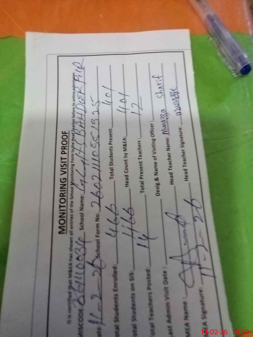 | Attendance Register | Head Teacher | MEA with School | Visit Proof |