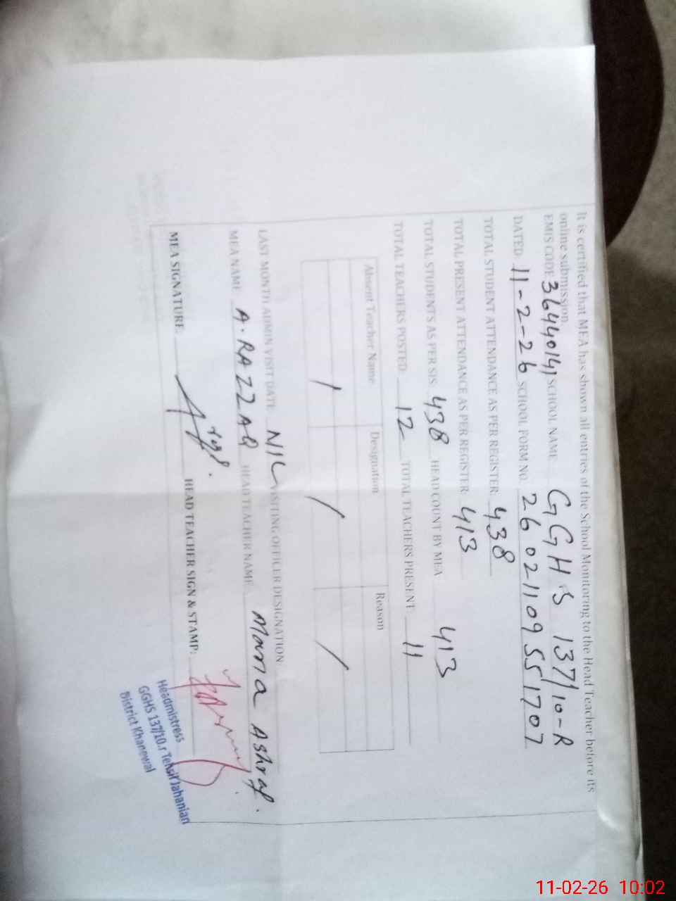 | Attendance Register | Head Teacher | MEA with School | Visit Proof |