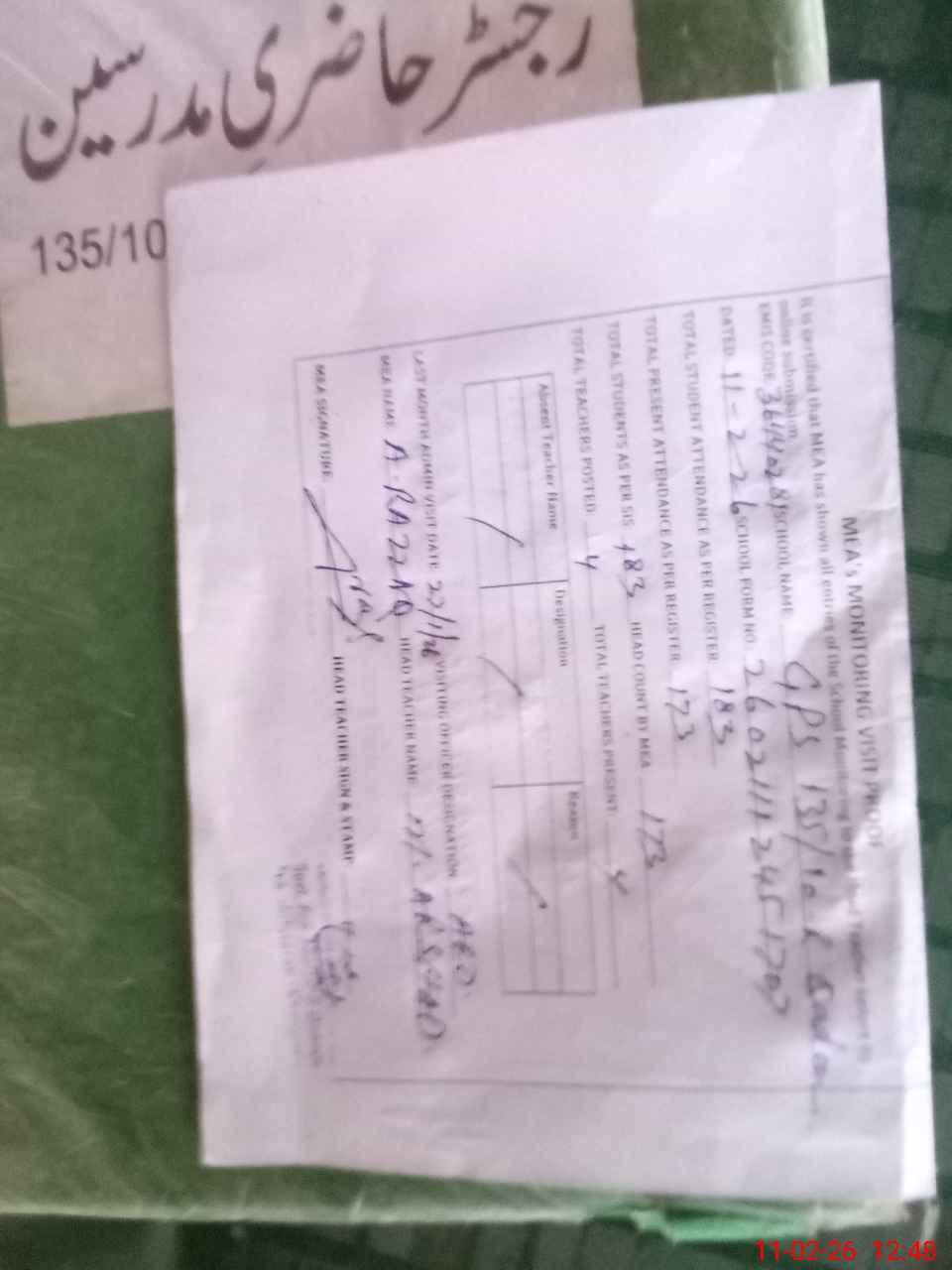 | Attendance Register | Head Teacher | MEA with School | Visit Proof |
