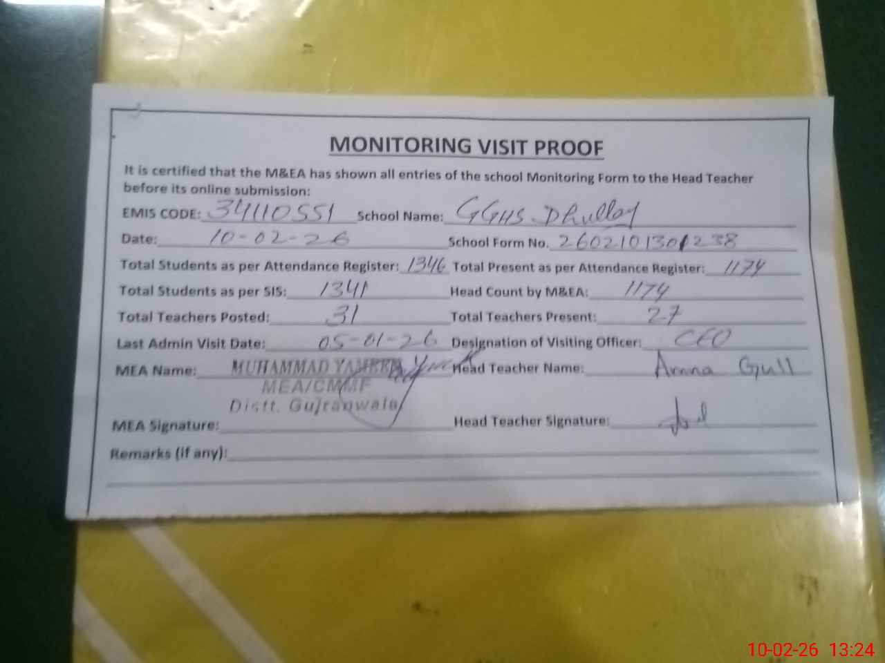 | Attendance Register | Head Teacher | MEA with School | Visit Proof |