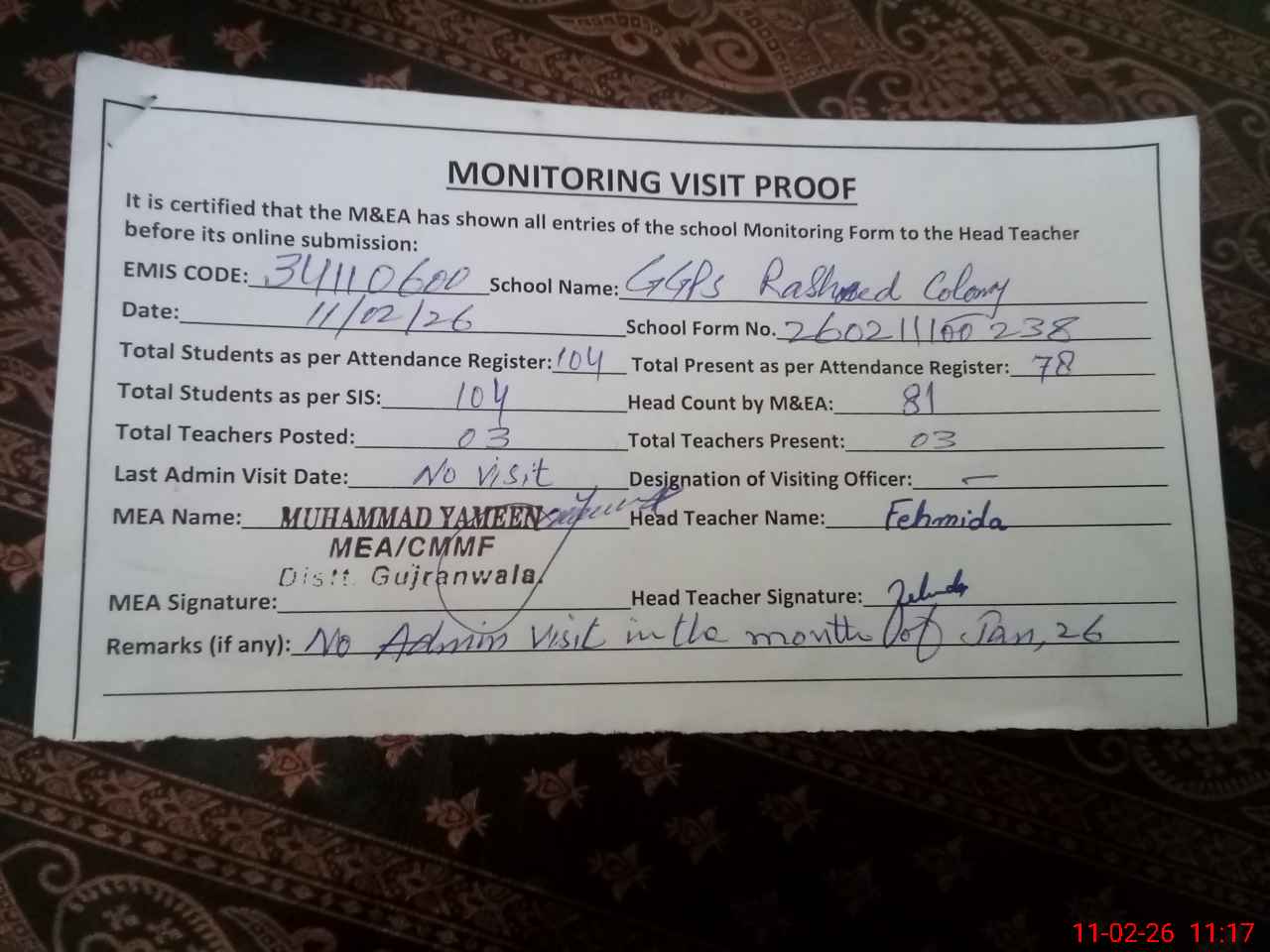 | Attendance Register | Head Teacher | MEA with School | Visit Proof |