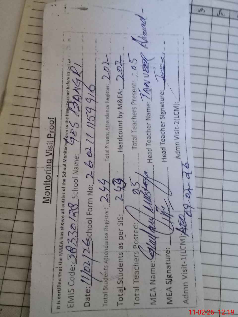 | Attendance Register | Head Teacher | MEA with School | Visit Proof |