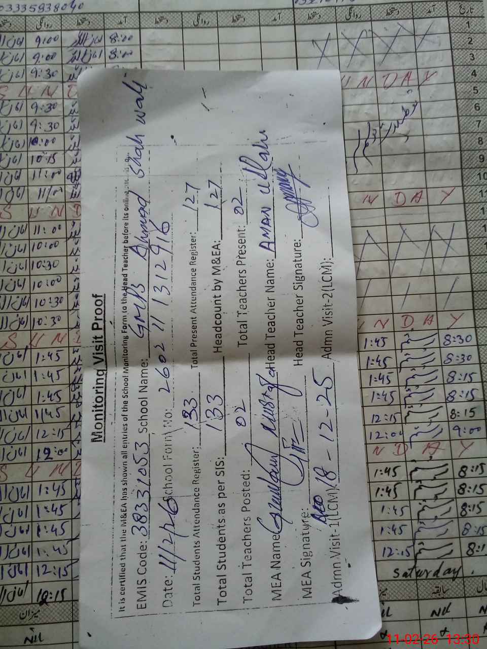 | Attendance Register | Head Teacher | MEA with School | Visit Proof |