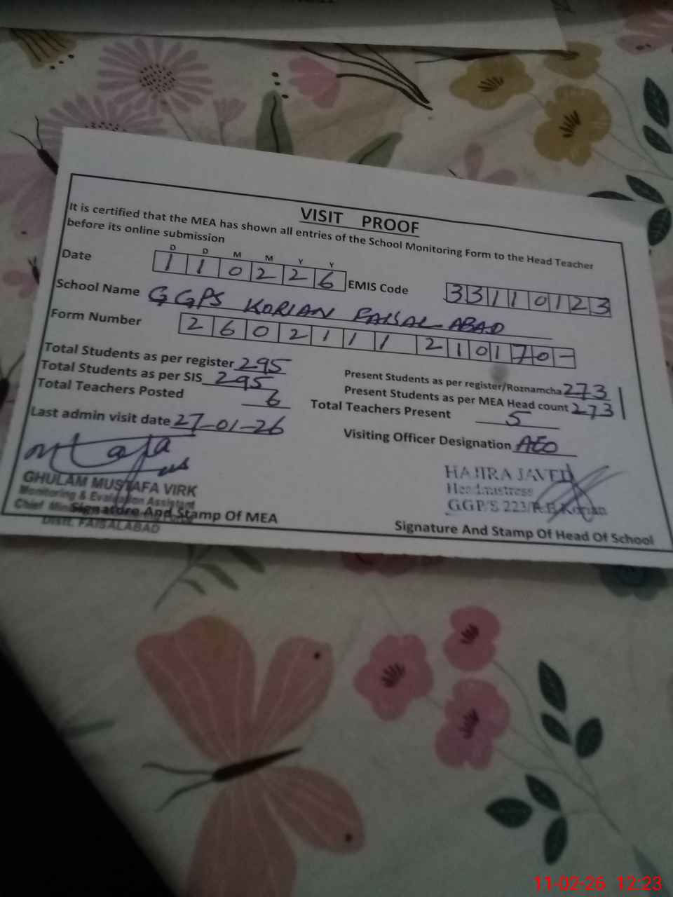 | EMIS Code: 33110123 | Name of School: GGPS KORIAN FAISALABAD | |||