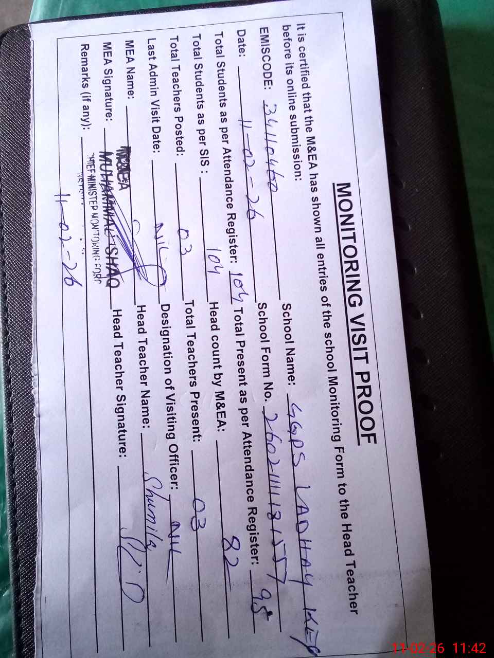 | Attendance Register | Head Teacher | MEA with School | Visit Proof |