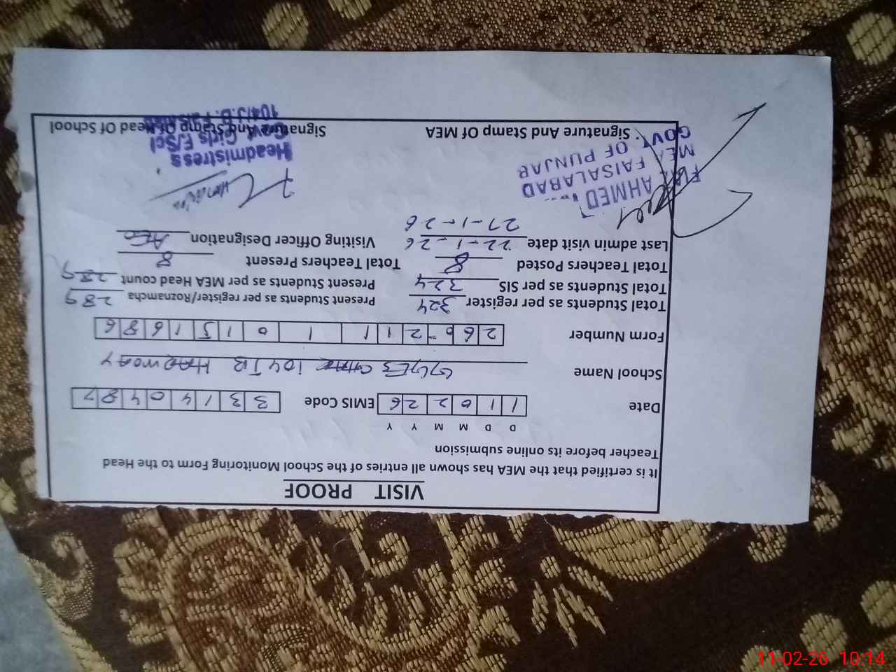 | Certified that this School was Inspected by the Undersigned MEA/DMO Today and the Information Stated Above is as Per Record. | |||||
