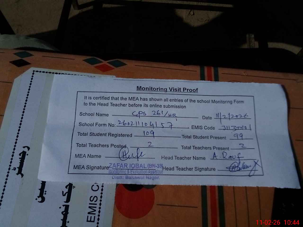 | EMIS Code: 31130101 | Name of School: GPS CHAK NO 261 HR | |||