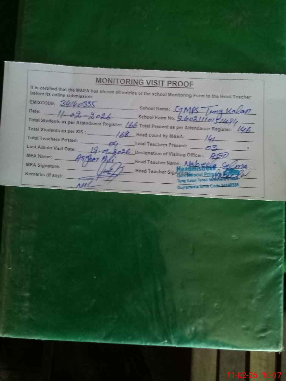 | Attendance Register | Head Teacher | MEA with School | Visit Proof |