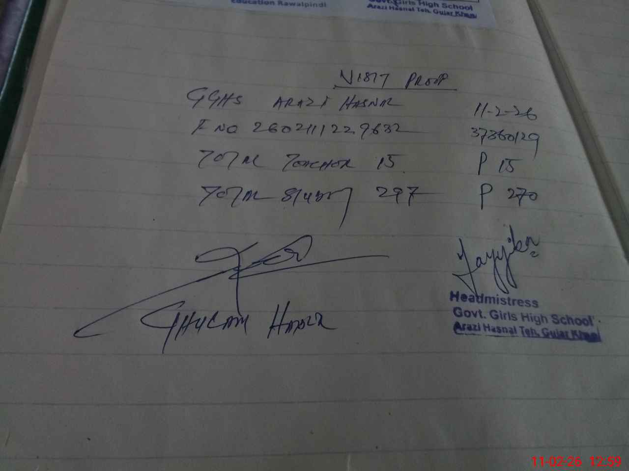 | Name: Ta**** Hu**** Designation: (School Headmaster's/Headmistress's) SST Science Phone/Cell Number: 03**** |