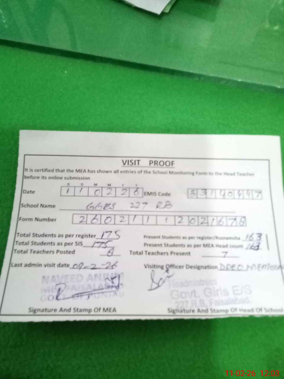 | Attendance Register | Head Teacher | MEA with School | Visit Proof |