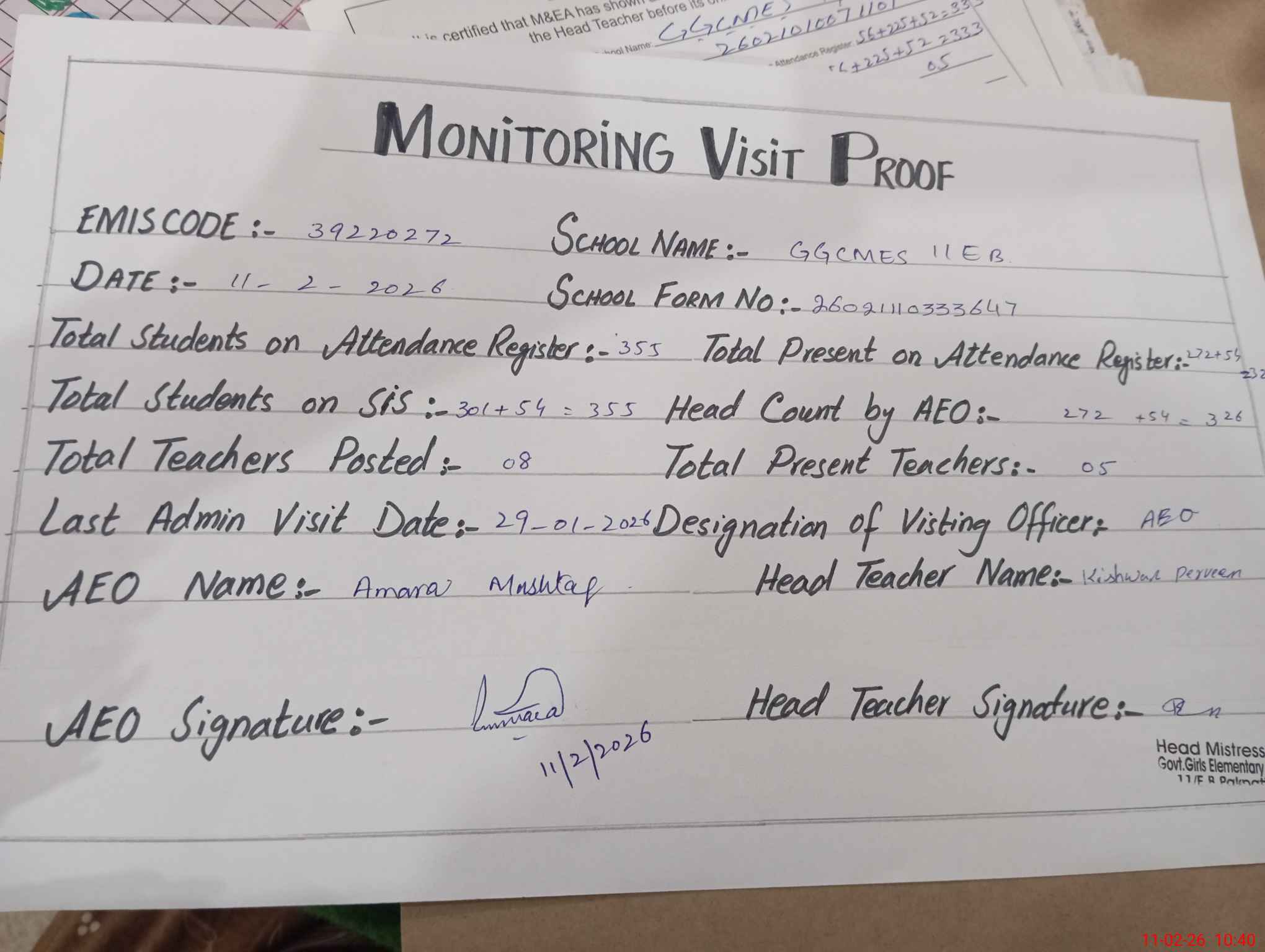 | Attendance Register | Head Teacher | MEA with School | Visit Proof |