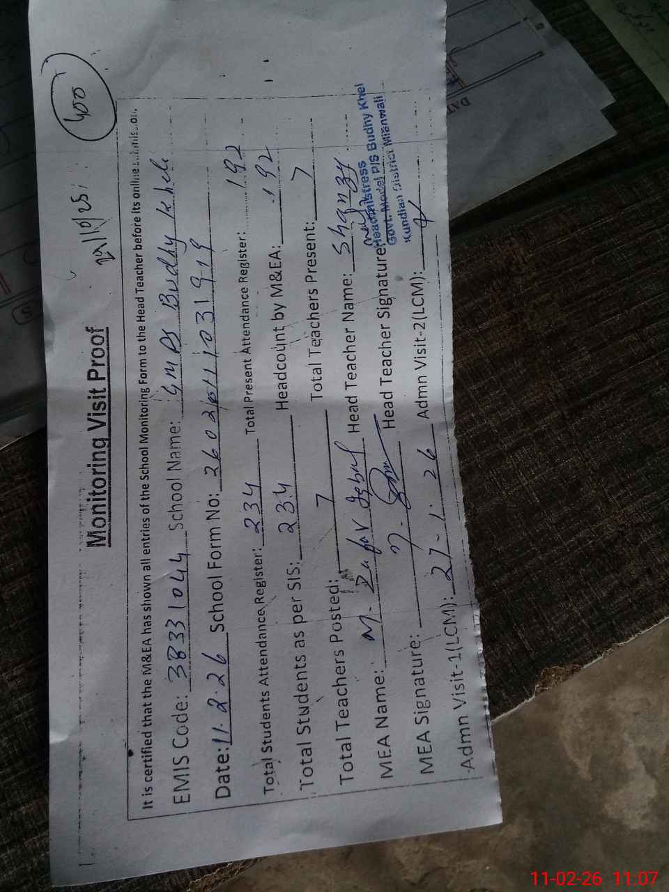 | Attendance Register | Head Teacher | MEA with School | Visit Proof |