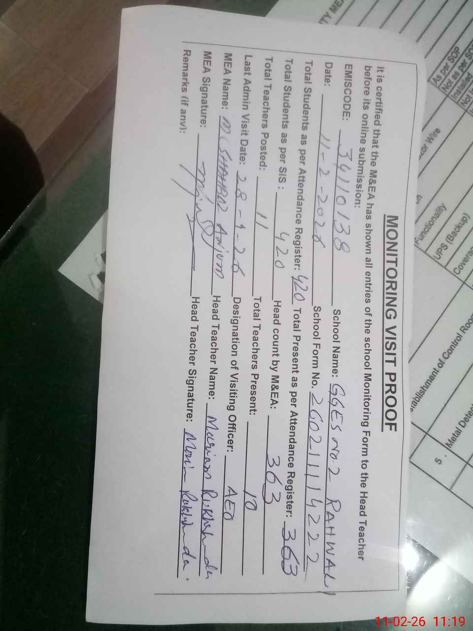 | Monitoring Date: 11-02-2026 | Start Time: 11-02-2026 10:27 AM | End Time: 11-02-2026 11:21 AM | Name of MEA: S-**** Sh**** An**** | |