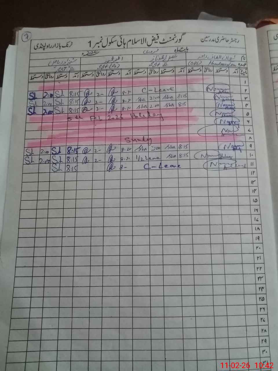 | CNIC | Full Name | Designation | R/C | Absence During Last Calender Month |