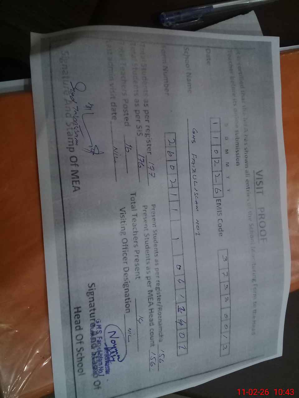 | Attendance Register | Head Teacher | MEA with School | Visit Proof |